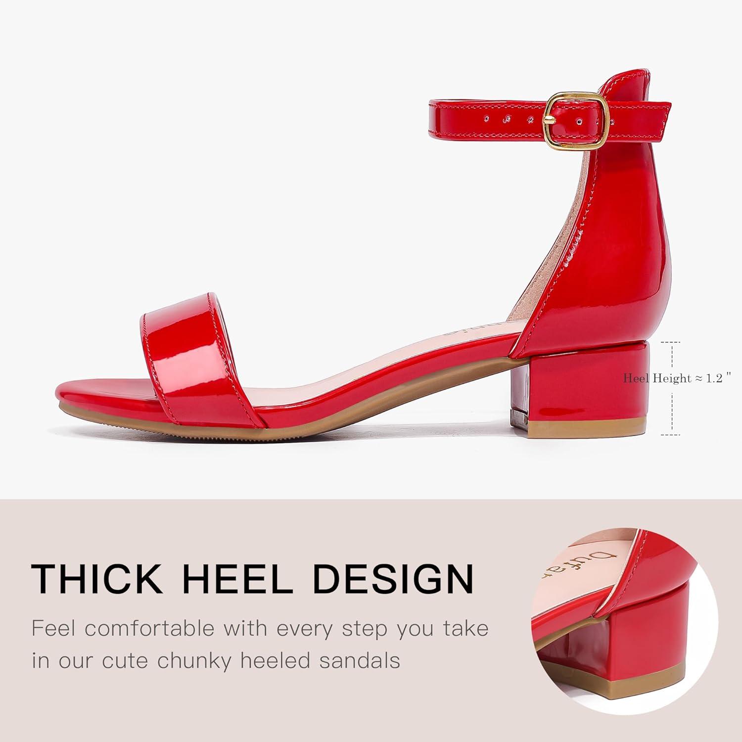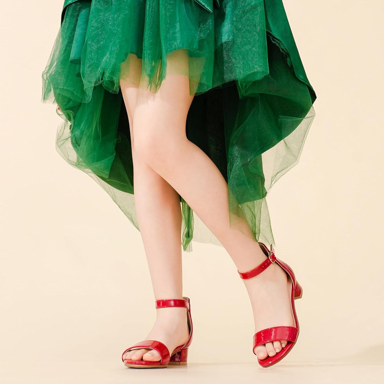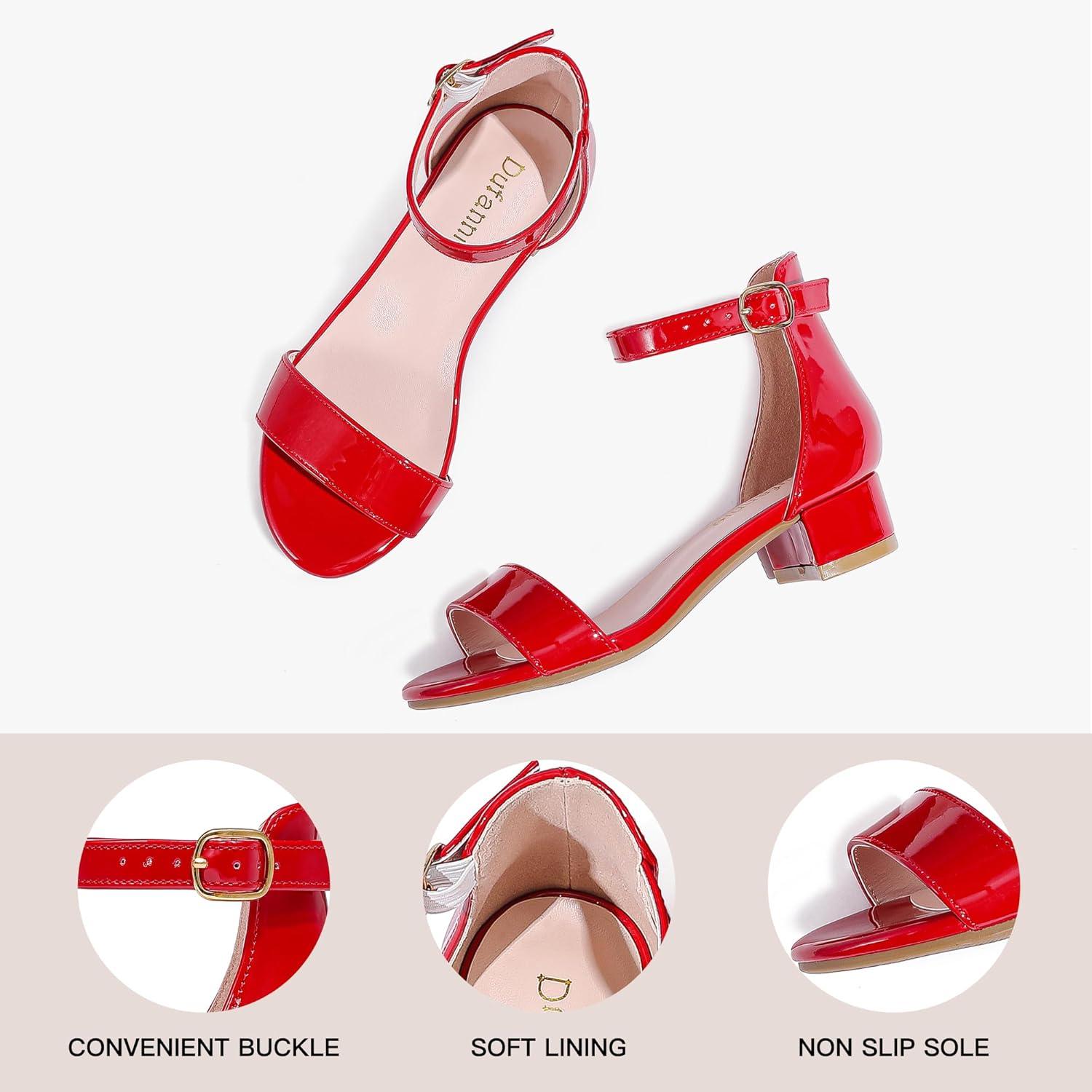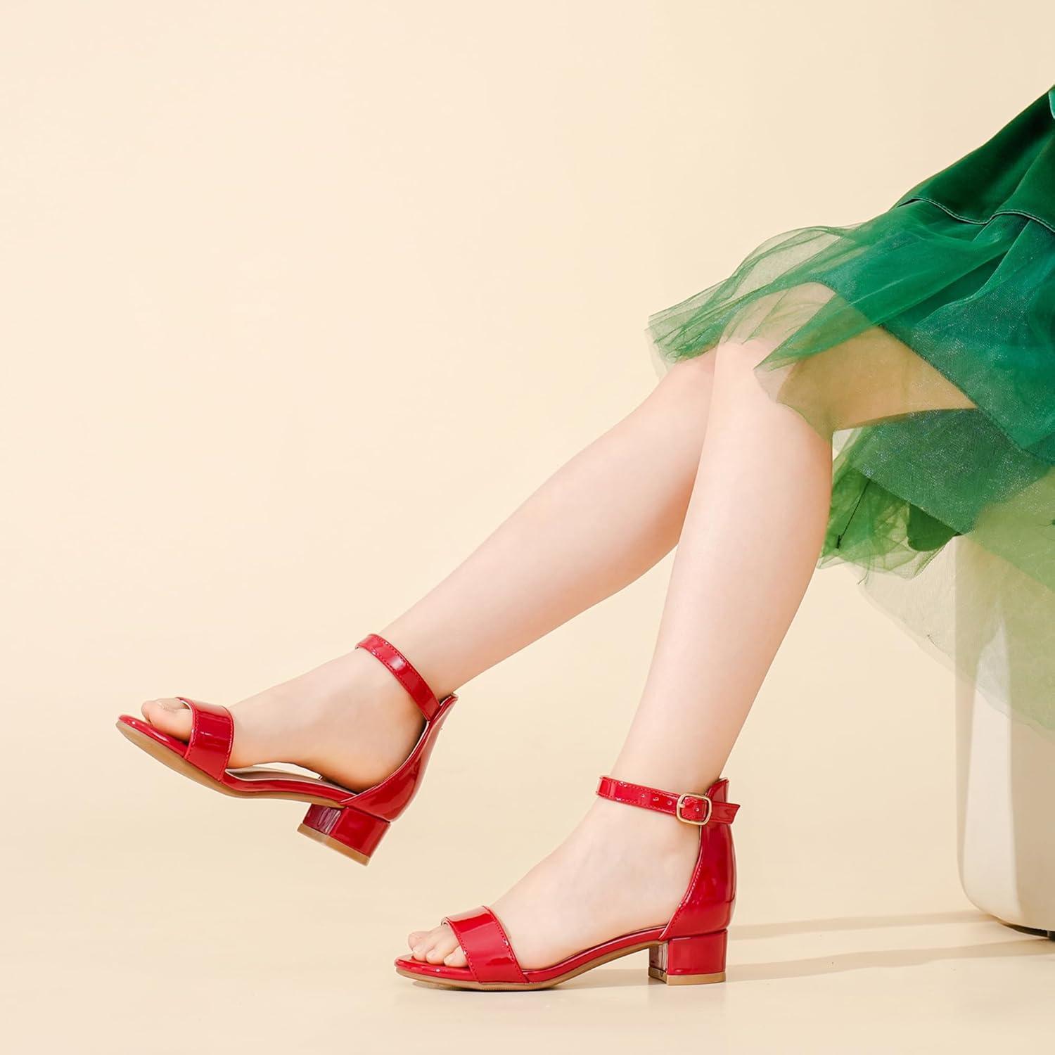 Dufannie Girls Sandals Low Heels Dress Pump Ankle Strap Open Toe Flower Girl Wedding Party for Toddler Little Big Kid(Patent Red Single)