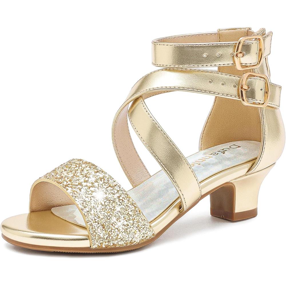 Dufannie Toddler Little Big Kid High Heels Flower Girls Party Dress Shoes Glitter Pump Sandals(Cross Patent Gold)